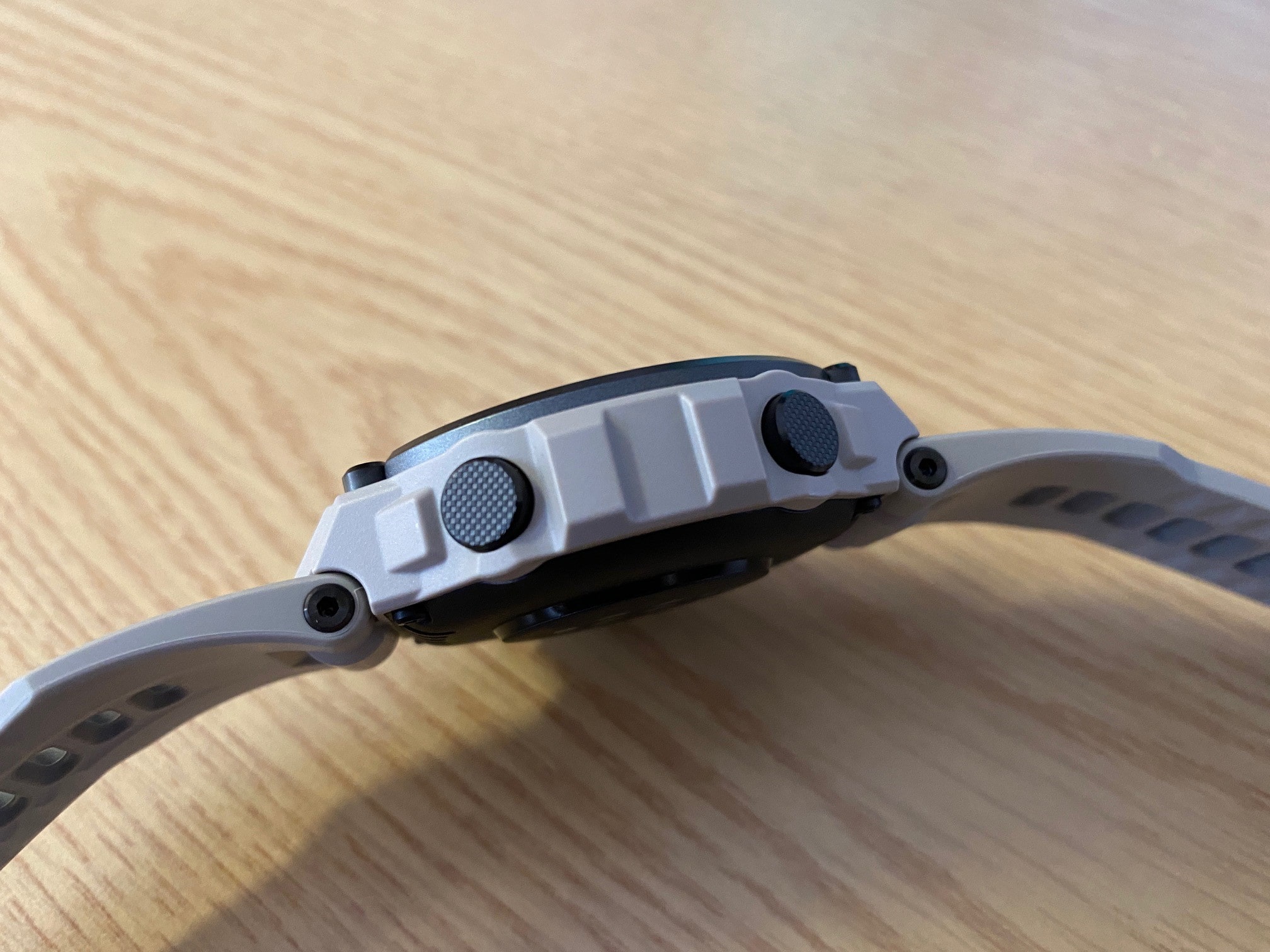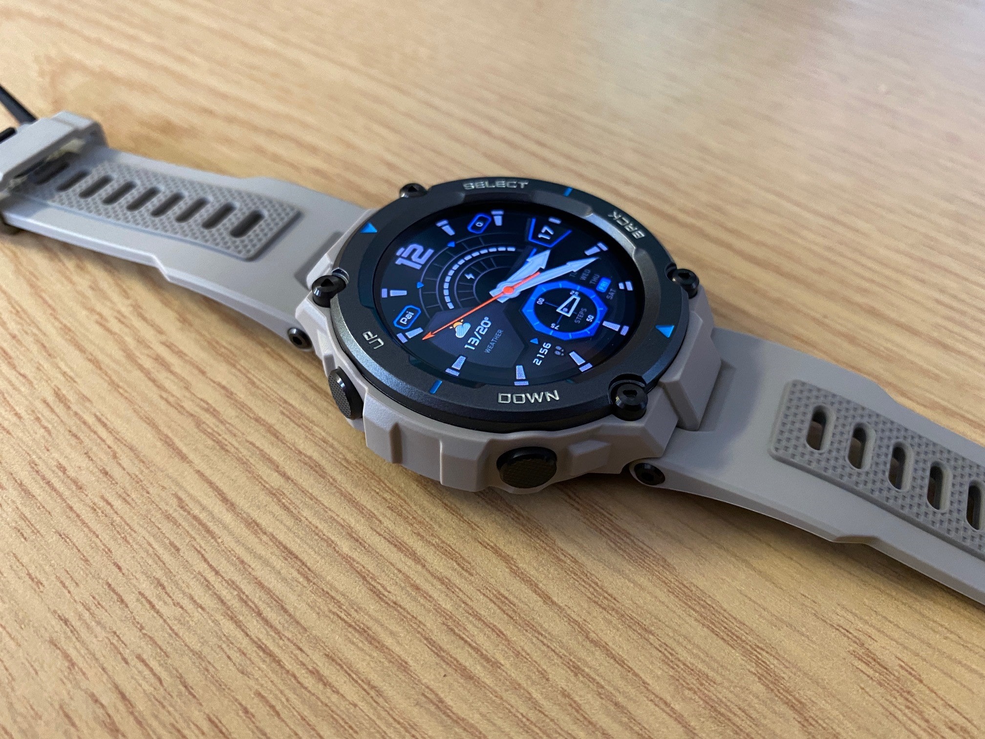 Out the box, it’s quite a large, chunky watch, taking inspiration from the likes of the classic Casio G Shock. Screen width is 35mm, with the overall watch being about 50mm. So if you’re used to a 38 or 42mm watch, this will feel big on your wrist. The watch is incredibly lightweight and overall, it looks pretty well built. Rugged in appearance, it comes in three different colours, sandy grey, black and blue. Plastic construction with a rubber strap. The strap has ample notches, so you can easily achieve a nice fit. However, once the strap is on, when you feed the excess through the loop, there is a notch that holds it in place, which is fine but because of that notch, it’s annoyingly difficult to pull that excess strap through.