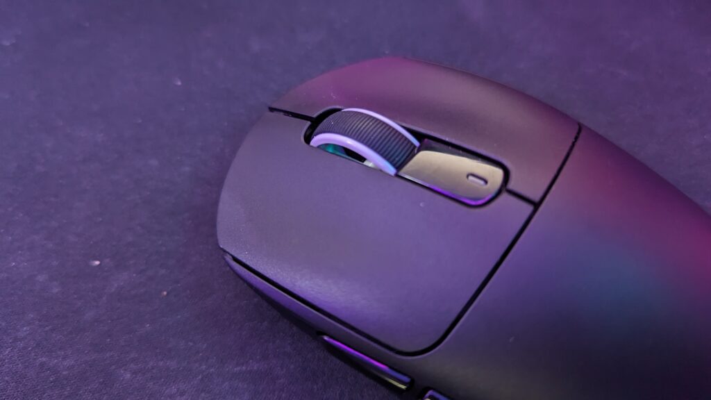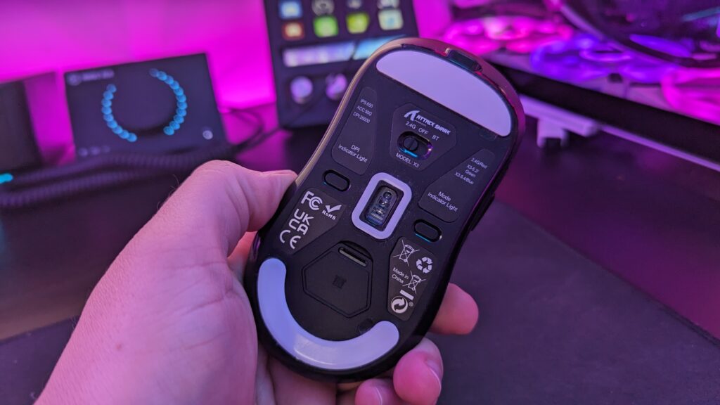 Having the Pixaart 3395 sensor means you can get a maximum of 26,000 DPI with 50g of acceleration. There’s a tracking speed of 650ips and you’ve got a millimetre of lift-off distance. It has something called MotionSync, which similar to the Gravastar M2, synchronizes the sensor readings with polling events. It’s supposed to make your motion in your movements feel more consistent, but hey, it feels the same to me as my Logi 502X and any other gaming mice I’ve used. I did say I was a casual gamer, right? On the bottom, you can find three buttons surrounding the sensor. At the top you have a slider to switch the mouse between 2.4G and Bluetooth, of which I’m using 2.4G as a dongle was provided in the box. The left button is there to adjust the DPI in increments which can be set in the Attack Shark software, more on that in a moment though, and on the right-hand side is a button for your Mode/Indicator light.