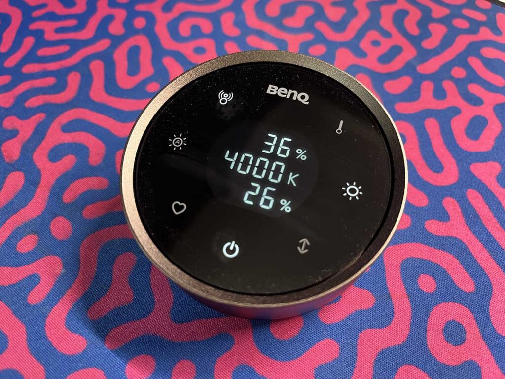 There are seven touch buttons in total. Moving round clockwise, you have colour temperature, brightness control, light selection, either front on, back on, or both on. Then the power on/off button, although there is a push button on the underside too, for on/off. Then favourite mode, auto dimming and presence detection. The last button is the rotary dial itself, which has a smooth, endless rotation, where you can adjust the colour temperature or brightness. You just select that mode and then spin clockwise to increase, anti-clockwise to decrease.