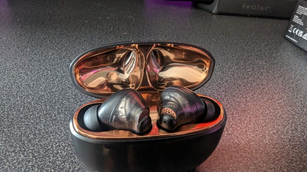 But one area that I am not keen on at all with the Ace 2 is the inner lining of the charging case which is this metallic bronze type colour. Now I know it’s to match the outside of the case giving off the hints of orange, but here it just feels a little too blingy. The inside of the standard Ace earbuds is much nicer and to be honest with you between the two designs, I do prefer that of the opaque black style of the Ace, though realistically there’s not a huge difference between the two, and to be honest I don’t really think the gold/bronze inner housing and see-through translucent grey casing makes it look the more premium offering that it is.