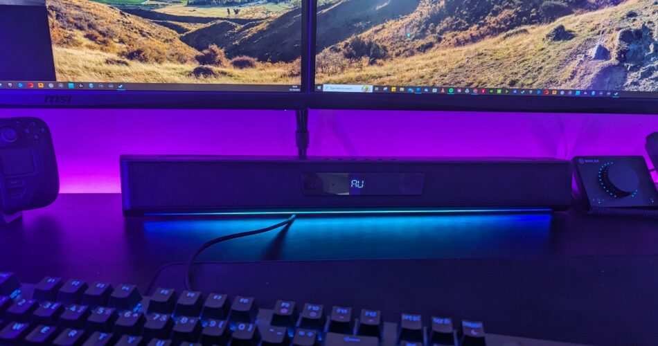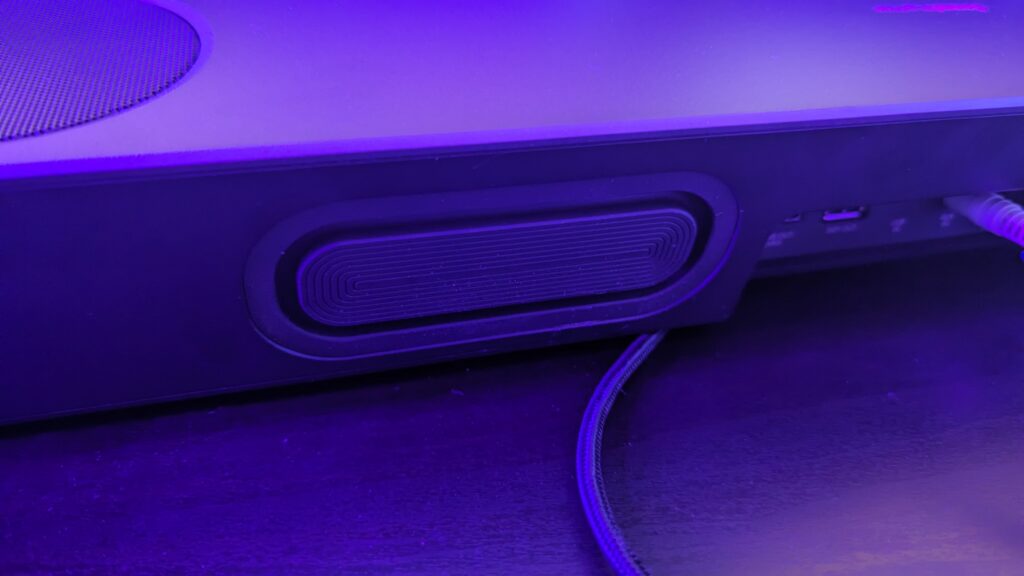 So the Creative Katana Stage measures at 650 x 109 x 78mm, slightly larger than the V2X so keep that in mind when it comes to real estate on your desk. It’s covered in a gunmetal-type grey plastic coating with an almost black front grill which wraps around the sides. On top, you can find two up-firing mid-range drivers which pair with two tweeters inside on both left and right, and around the back are two sub-drivers which can pack a punch when needed. There’s an RGB strip which comes with a few customisations, including an audio reaction mode, and this can be customised inside of the Creative App for your desktop, or it can be turned off completely if RGB isn’t for you. Overall you’ve 90 watts of RMS from the soundbar, and I must say this thing can get pretty loud.