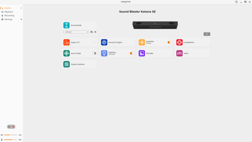 Looking through the Creative App, the software offers several decent customisations that you can make to the overall performance and sound quality of the Katana SE. The first I want to point out is the Acoustic Engine, which allows you to put a few audio effects onto your audio, being a virtual surround sound option, a crystallizer which enhances background audio and a dialog+ setting to enhance voices in various media. Scout Mode is intended for multiplayer game use, to aid in footsteps and bullet direction in first-person shooters. It’s alright, but not as accurate as wearing a set of headphones. And finally, you’ve got an equalizer for presets or custom EQ settings to fine-tune your audio, and also a mixer which can be used to pan audio, or set the microphone and audio levels independently. The Katana Stage does have a built-in microphone that’ll get you through a Zoom call with work, but it’s nowhere near the quality expected from livestreaming or creating content. Get yourself a separate microphone for that.