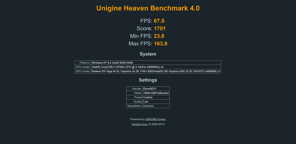 When I run a Heaven benchmark I initially ran it with all the bells and whistles you could expect from a gaming laptop. However, this did not work and I will stress that this laptop is not for gaming. I had to literally set everything to a minimum to get a playable frame rate from Heaven. Resolution was knocked down to 1080p, even though this is a 4K display, the quality was on low, there was no anti-aliasing, tessellation was turned off and so on and so forth. Granted the spec will probably get you through a game of League of Legends or Hearthstone with no issues, but don’t bank on Shadow of the Tomb Raider, although very playable at around 40fps at 1080p, looking any good. But to be fair, I wouldn’t consider this ultrabook if I was after something I could game on the go with. You’re going to be looking towards one of the Razer Blade laptops for that kind of thing.