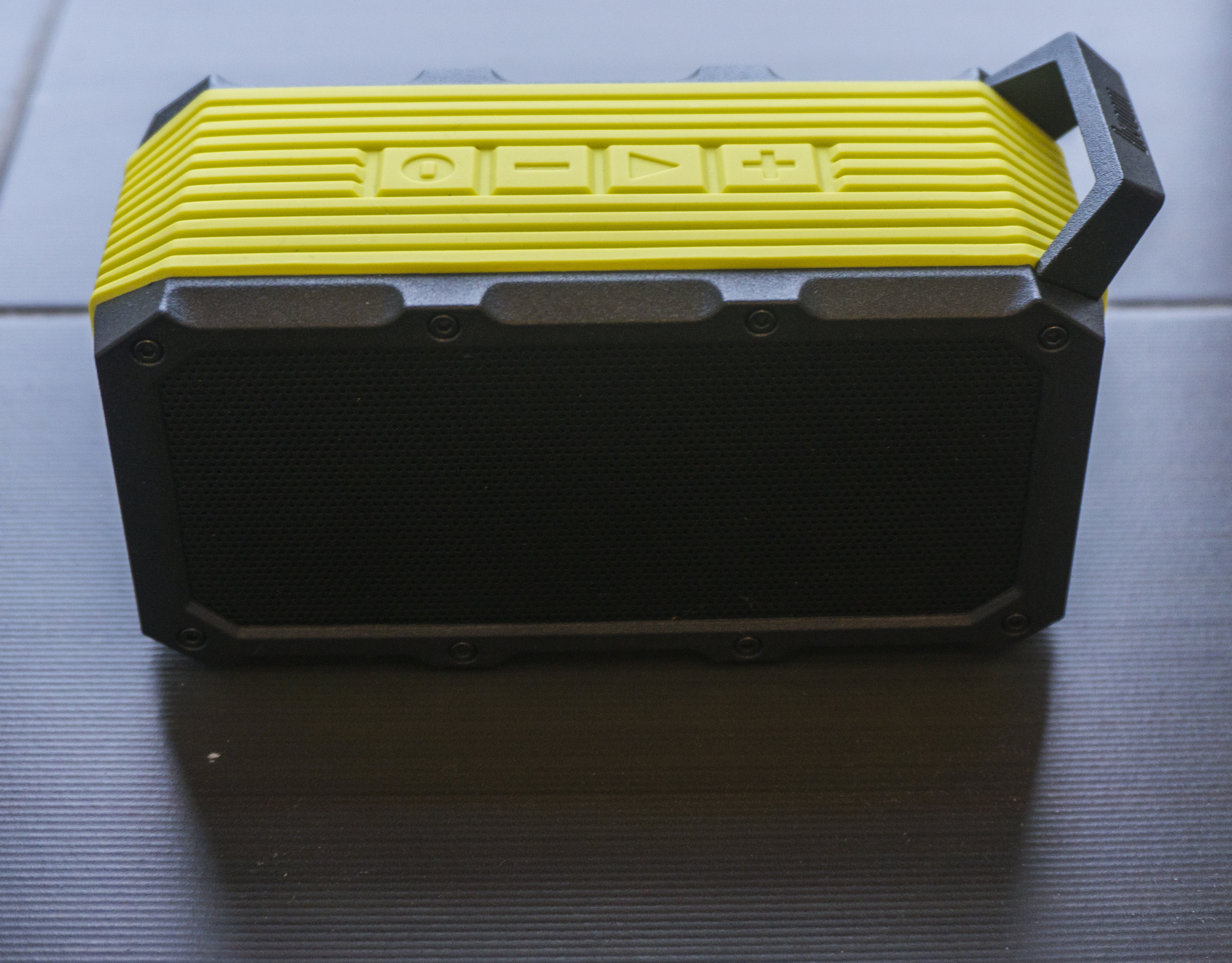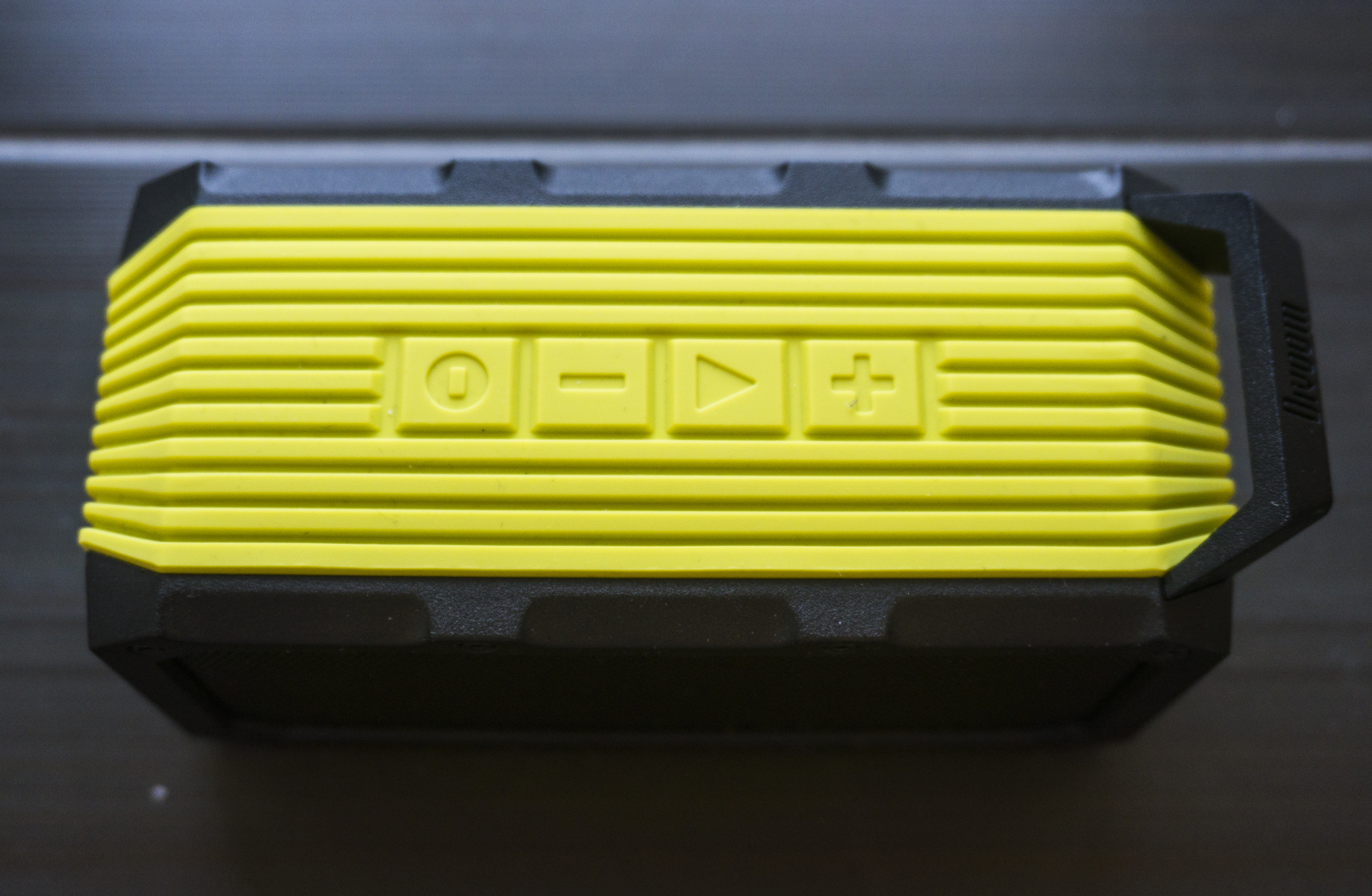 It has four buttons on the top for volume, power and playback. The side door is covering a USB slot and 3.5mm jack input for using wired connections from a laptop or MP3 player.