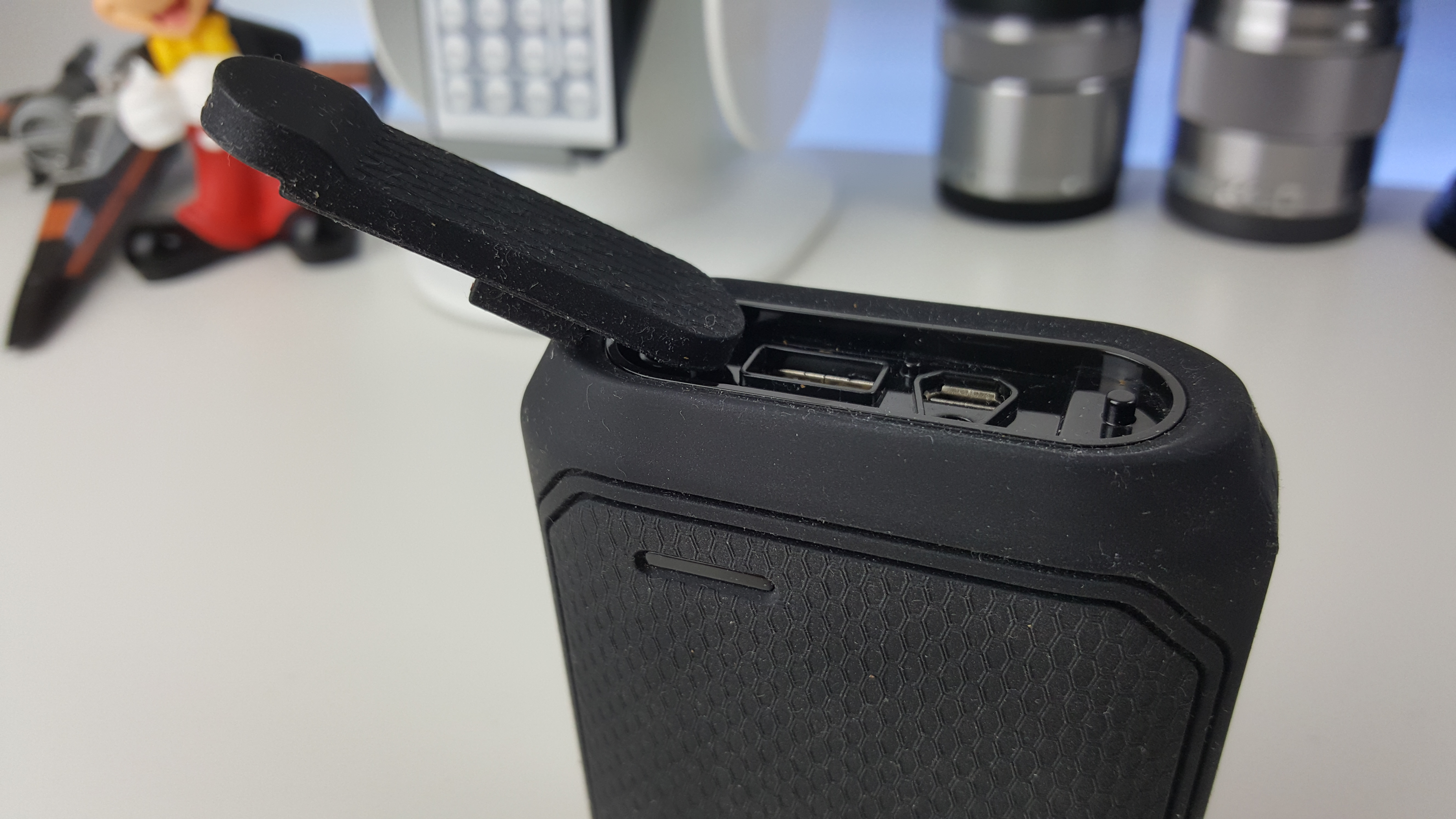 The Griffin Survivor isn’t very big, and would fit quite comfortably in your hands along with a mobile phone. The ports are covered by a rubberised strip to give them extra protection if dropped. There is also an input for a proper DC charger, although I wouldn’t trust sticking something like that inside the powerbank as