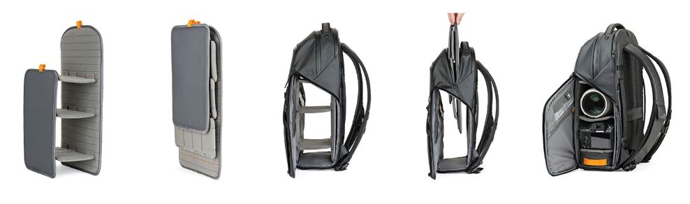 So what do we get with the Lowepro Freeline BP350AW backpack? Well, quite a bit of space actually. The whole backpack works off a three tier shelving system, with a top and two side zips for easy access. The bottom of these shelves houses a smaller bag with three compartments. Perfect for smaller accessories. The inclusion of two soft orange dividers makes it easier to protect your gear from colliding with eachother when you’re in transit. If it’s easier, you can snap the front and rear of the shelving unit to remove it completely from the bag to install your gear. However, you cannot install the dividers and then snap it down to put it back in the bag.