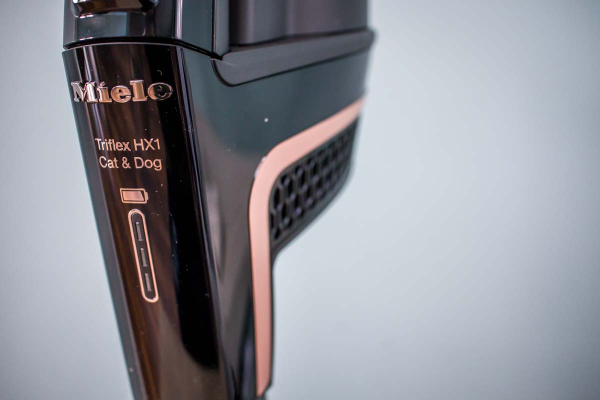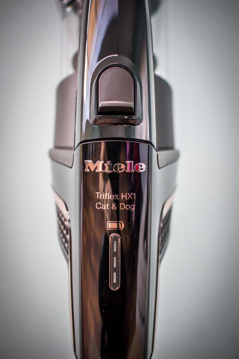 It’s the first time we’ve had a Miele product come through to us before but we’ve seen them at trade shows and from what we’ve been told, their reputation for quality and performance is renowned. We got sent one of their new handheld vacuum cleaners from their Triflex HX1 range. They currently have five in that lineup, ranging in price from £479 to £679, three with varying colours, one more suited for cats and dogs and one with an improved battery performance. We got the cat and dog version, which is good because I have two cats and one dog at home to clean up after.