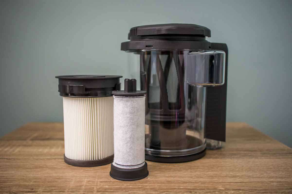 The motor is where the magic happens and this is where most of the tech is. On the handle is a single button, which has four different settings, off and power 1, 2 or 3. These numbers correlate with power output, 1 being a low suction, 3 being a high suction. Below that button is three small indicator lights, showing the battery level. Behind the handle is the motor section, along with the plastic dustbag, which holds a total of 0.5L of dirt. Inside the dustbag are two different filters, a pre-filter and a fine dust filter, both of which are removable. To remove them and/or empty the container, you need to twist the lid and then the whole container will become lose and you can move it away from the rest of the cleaner. Keep twisting it and the bottom exit cap will release, dropping out the dirt at the same time. Below the container is the battery, which is removable and has a single power inlet, for charging with the battery installed or removed.