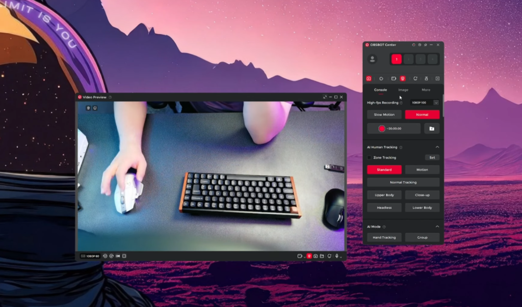 Diving into the OBSBOT Centre, you’ve got some pretty standard settings that you’d come to expect nowadays from higher end webcams on the market such as quality controls of which you can film in up to 120FPS at 720p or 1080p at 100FPS. You’ve got your image enhancements, auto and manual control over your image quality, and some beauty modes on there too so you can look all thin and pretty when on stream. Most interestingly though is the AI capabilities which offer various tracking for your face, body, feet, yes I know if that’s your type of content then no judgement here, and also your hands for when you’re filming on your desk. It’s all neatly packaged together and very easy to use, though do take note that to use this on third party software like OBS Studio or even Teams and Zoom, please turn on the virtual camera which is a button at the top so your effects and presets get carried across to said software.