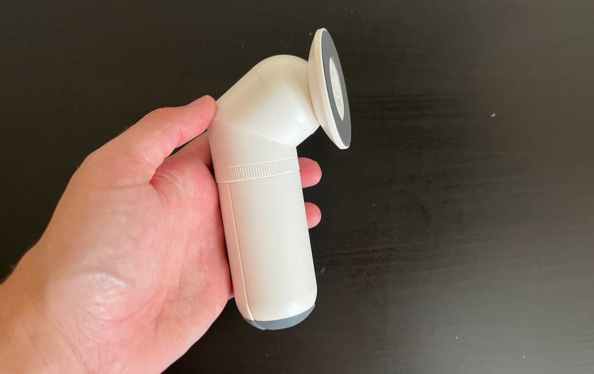 Simple and effective design. It looks a bit like a giant Tic Tac, with the MagSafe swivel head to the very top, it’s a grip as you move your hand down and then you can move the three legs apart at the bottom to turn it into a stand.