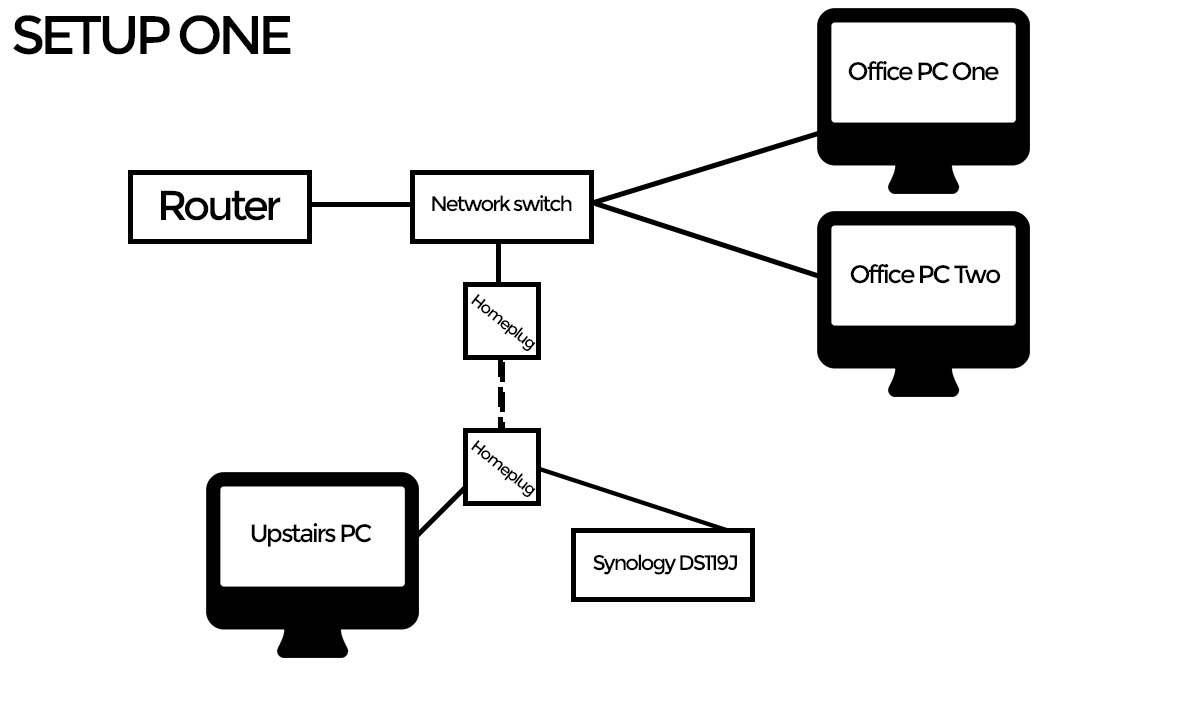 Setup was fairly simple. In fact, I was surprised at how easy it all was to get going. The unit requires power which is included and there is a Cat-5E cable included in the box too to plug it into your network. I ran a couple of tests on the drive from two different places in the house. At first I plugged the NAS into my homeplug, the same place my desktop is plugged into, and the second was plugging it into a gigabit port on my network switch so it could be shared by the majority of the PCs in my office. Results to follow, but below is a small diagram of how my network setups looked.