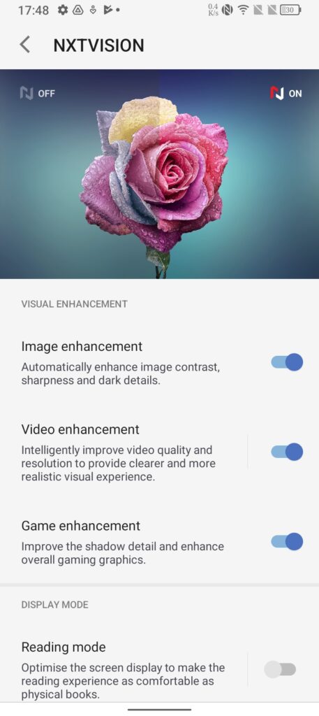 The TCL 40R 5G sports a 6.6-inch IPS LCD screen that’s actually pretty sharp and bright at 400nits of brightness. It’s a 20:9 aspect ratio with a resolution of 720 x 1618 with a contrast ratio of 1500:1. It’s got a 90Hz max refresh rate, which can be turned down to 60Hz if you want to save some battery life and it’s also got a smart setting where it can auto-select the refresh rate depending on what you are doing with the phone. The 40R 5G also has access to TCL’s NXT Vision software which offers various settings to aid with image quality. It’s split into three, being image, video and game enhancements, and all aid in increasing things like contrast ratio and sharpness, shadow detail and overall resolution. With NXT Vision there’s also a reading mode and eye comfort mode to aid with minimising eye strain. And finally, a way of changing the colour temperature of your display. From warm, cool and a neutral white balance. The small notch at the very top of the screen, well, more of a teardrop style of notch that hides the selfie camera. It doesn’t at all distract away from the screen which is great. It’s very unobtrusive and out of the way.