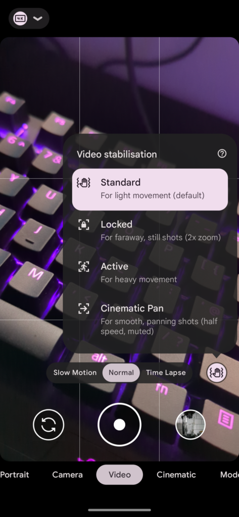 The final feature I want to talk about is the Pixel 7 Pro’s image stabilization capabilities, which come in four forms: Standard, for light movement. Locked, for far away still shots, like if you’re filming a scene. Active, for a lot of movement like if you’re running around chasing a subject, and even a smooth Cinematic Pan, which will be great for establishing shots or even some b-roll when making YouTube videos. With all of these, it offers a smooth way to capture footage and reminds me of the type of footage you could get from a GoPro or similar action camera.