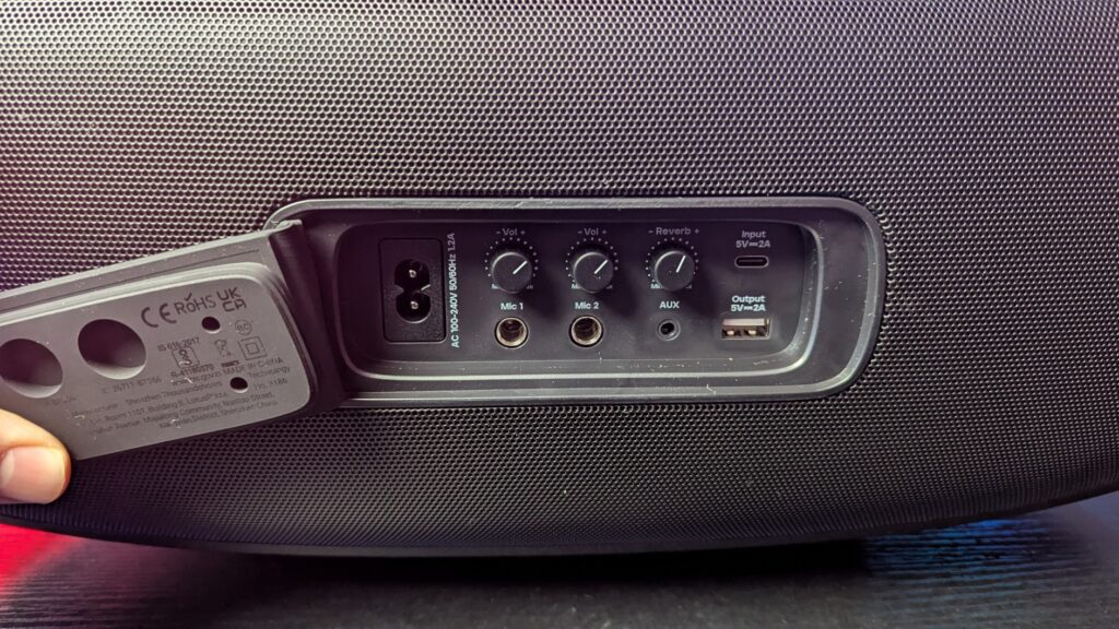 Around back you’ve got a rubber door that covers the IO. And this is where it gets interesting because you’ve got your standard figure-eight power input, a USB Type-A port for charging devices, and a 3.5mm aux input for audio sources and a USB Type-C input for power too. But you’ve also got two 1/4-inch microphone inputs for karaoke so if you fancy doing a bit of singing, then you’ve got the option there, both with individual gain settings in case one of you sounds awful. Just turn them down! It does connect to mobiles using the newer Bluetooth 5.4 connection which aids with range of which TRIBIT are quoting just under 170 feet which is insanely huge.