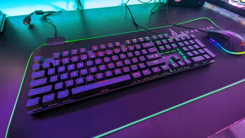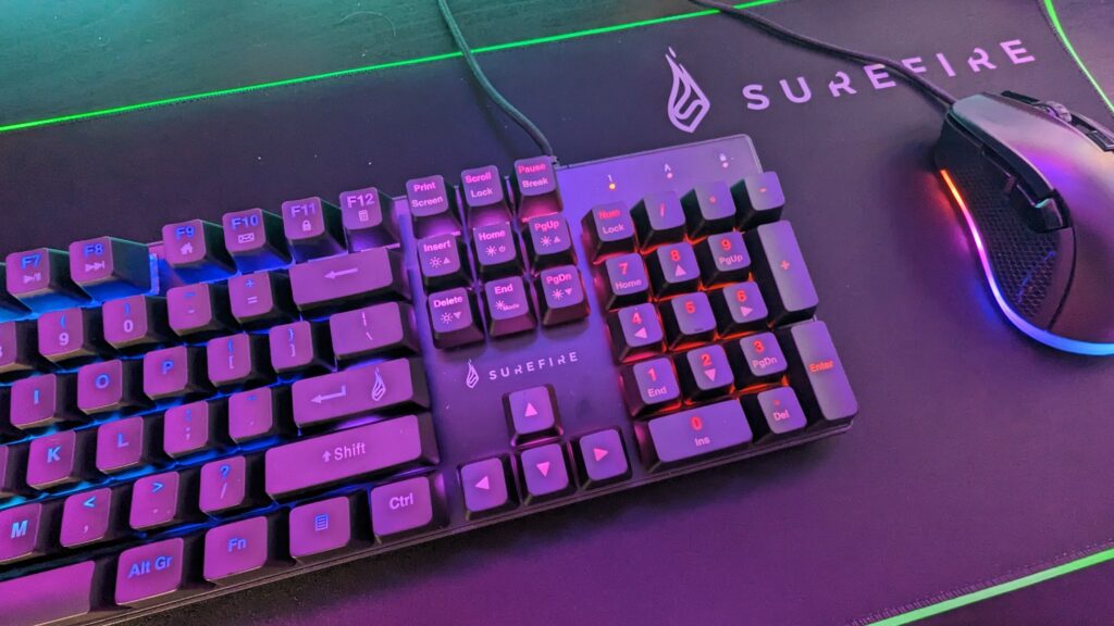 So, let’s start by talking about the Surefire Kingpin M2 keyboard. It’s a full-sized mechanical keyboard with a number pad on the right. There is an M1 version which is pretty much a TKL keyboard. The frame itself is made from a galvanised metal which gives the Kingpin M2 a real quality feel. It’s super heavy as well which was surprising when I first took it out of the box. It features multi-optional RGB lighting and there’s a partner software that you can download from the Surefire support page, but more on that in a moment as it’s a peculiar story. You can use keyboard shortcuts to set your RGB lighting effects, and there’s a guide on how to do that on the support page too. It uses mechanical Red switches and actually feels quite nice to type on, and the keys have quite a satisfying click to them.