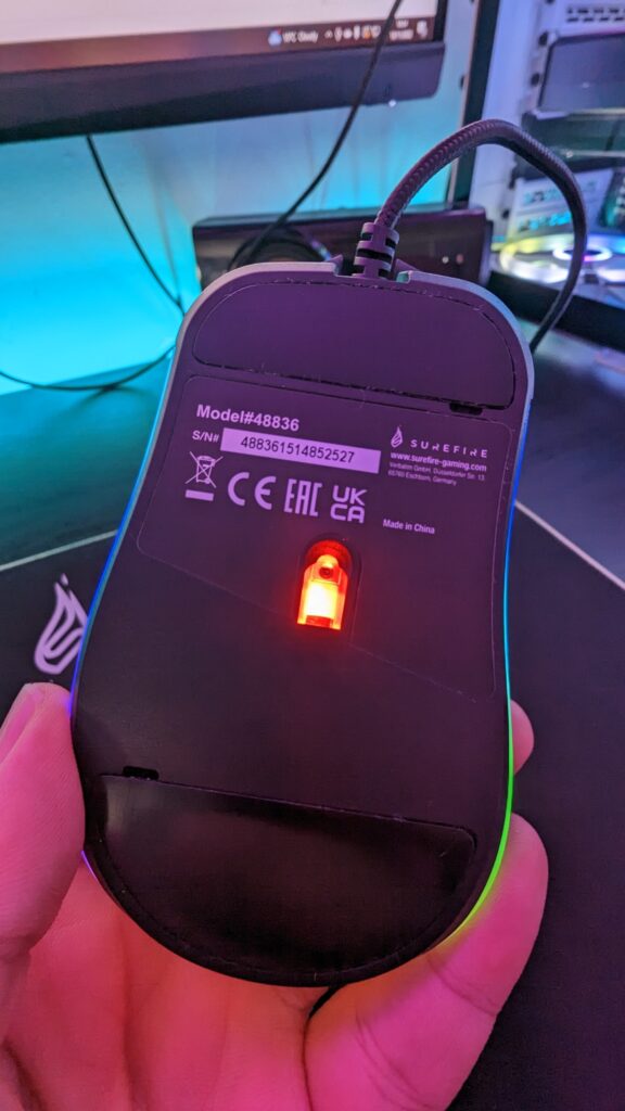 The base has two large smooth plastic feet at the front and rear of the mouse which helps with the glide, and a 7200FPS sensor that’s capable of up to 7200DPI. The increments on the mouse are adjustable to 800, 1600, 2400, 3200, 4800 and 7200DPI. There is software that you can download, but my experience with the keyboard software has pretty much put me off downloading any driver from the Surefire support page. I do like however that you can assign colours to the mouse depending on the sensitivity you have set. So for example, I have a yellow colour against my 800DPI setting, so I can easily tell when I’m in that mode.
